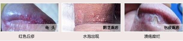 【男性生殖器疱疹症状】:男性不慎染上HSV病毒以后,平均在6天左右,部分患者会开始有身体上的一些症状,如:在男性的包皮、龟头、冠状沟、阴茎、尿道口以及肛门等处,可发现一簇或多簇红色的小丘疹,随后演变成水疱,几日后,水疱又再次演变成脓疱。脓疱破裂,形成糜烂或浅溃疡,患者可有疼痛和瘙痒感。
